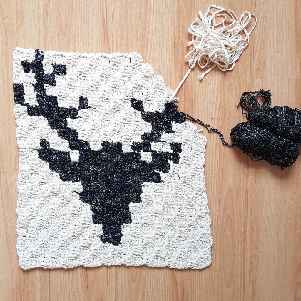 Falando um pouco sobre crochê, adoro a técnica do C2C, porque entrega muita textura de um jeito não convencional. Os pontos não se formam em linhas retas, mas em bloquinhos na diagonal, que se encaixam como um quebra-cabeça bonito e elegante.